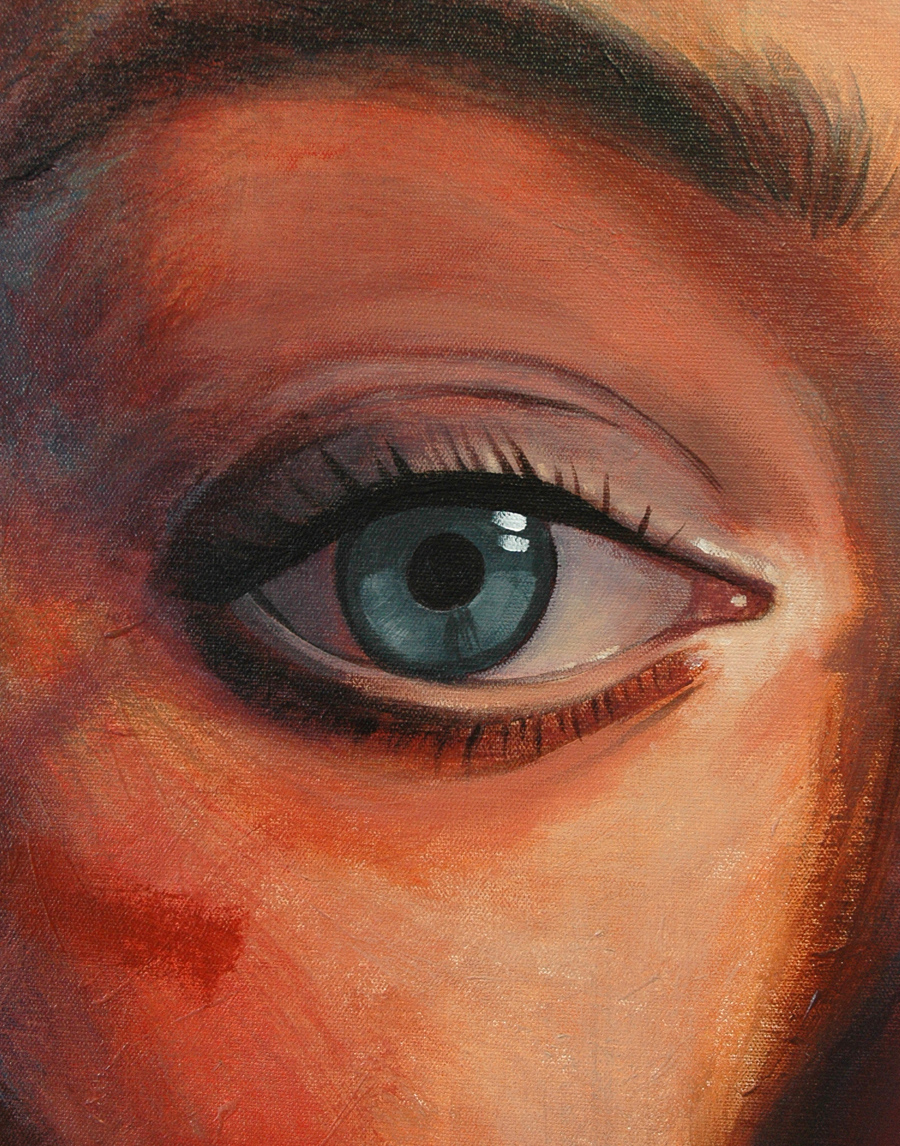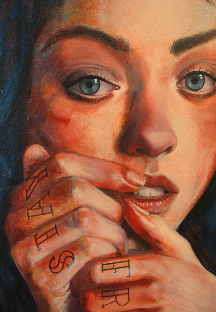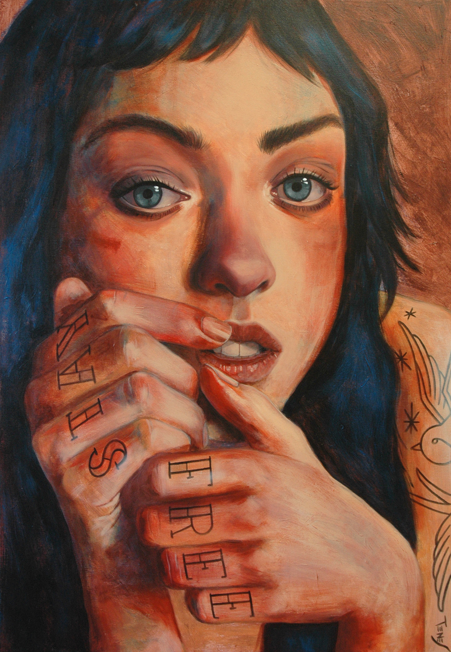 Retrato acrílico de una joven con fuerte carga emocional y el tatuaje "Stay Free", por Jaume Tenes.