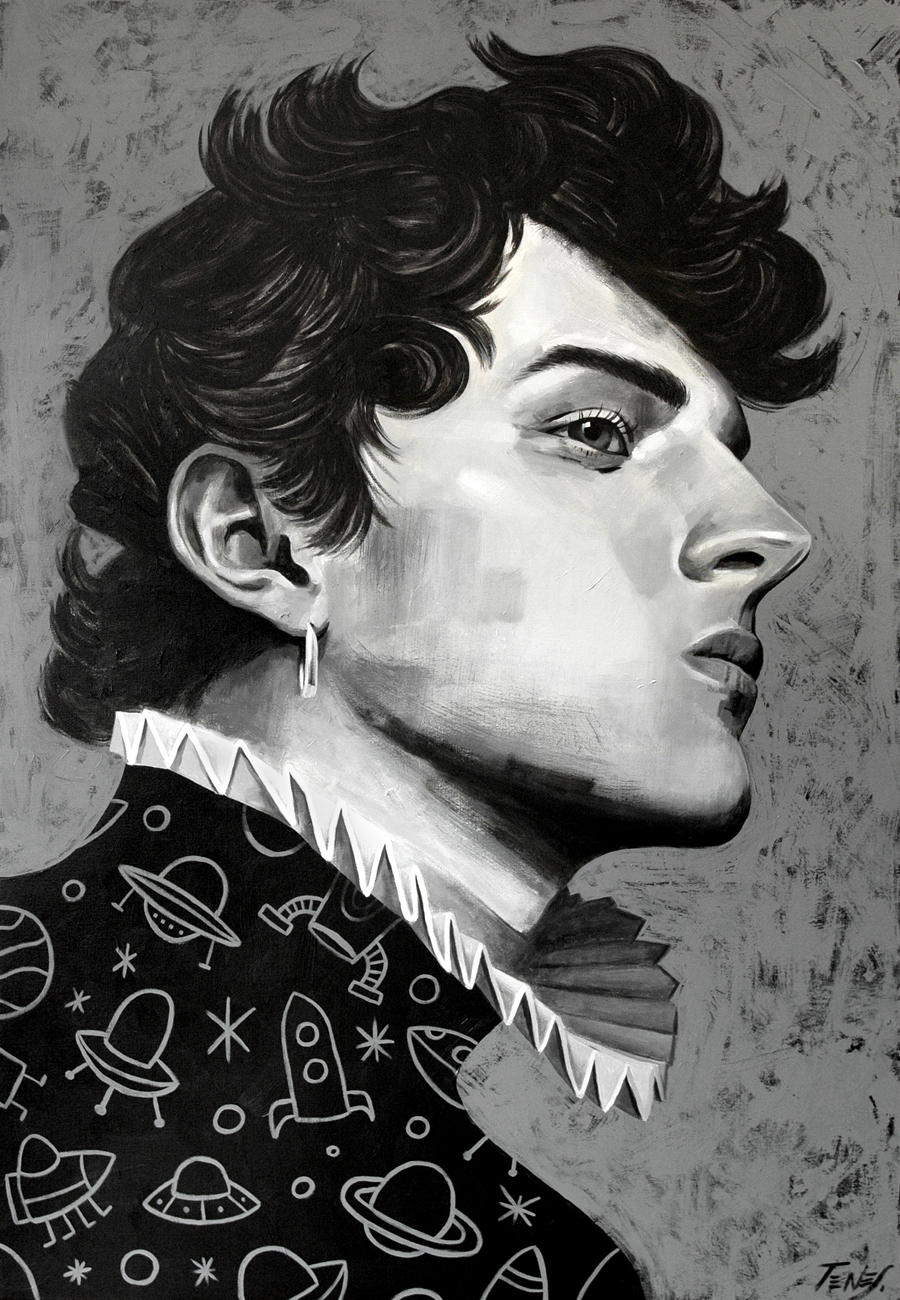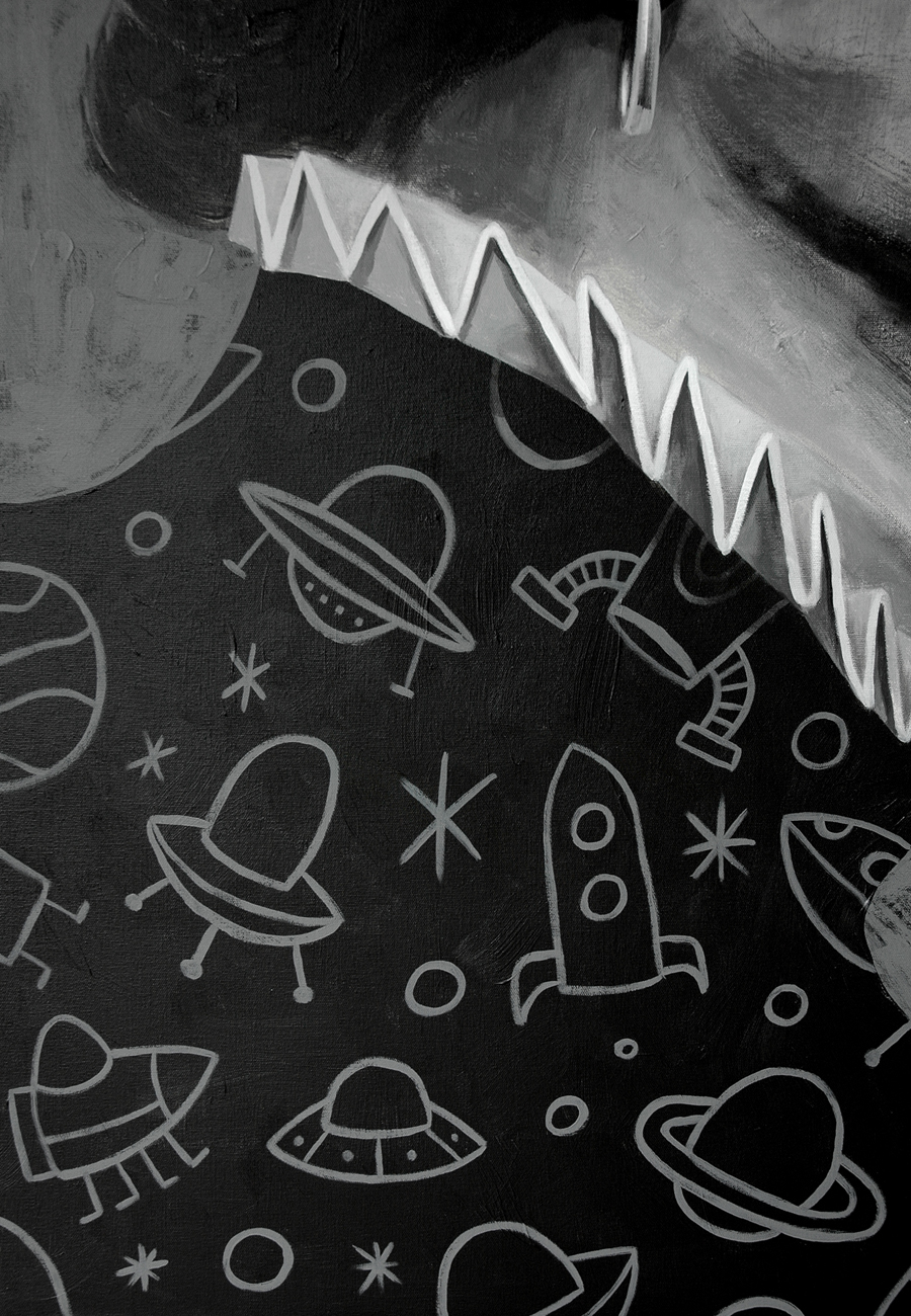 Figurative black and white acrylic painting "We Are Not Alone" by Jaume Tenes.
